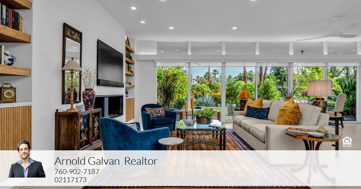 Welcome to 1403 Tamarisk West Street, a mid-century modern residence by the legendary architect S. Charles Lee, whose iconic Hollywood theaters helped define California's architectural legacy. This 2-bedroom, 2-bath home offers 2,376 square feet of light-filled living space, thoughtfully updated to preserve its original character while incorporating modern comforts. From the moment you step through the bold entry door, you're greeted by high ceilings, expansive glass walls, custom motorized shades and panoramic views of lush landscaping and the sparkling community pool. The Great Room features multiple sitting areas, a double-sided slate fireplace, built-in bookcases and a wet bar. The seamless indoor-outdoor flow is ideal for entertaining. The updated kitchen features sleek cabinetry, granite countertops, a glass tile backsplash, and newer stainless-steel appliances. A small private paver patio with a built-in BBQ completes the separate dinette area. Both oversized bedroom suites offer updated bathrooms with spa inspired walk-in showers and walk-in closets. The primary suite bathroom also has a free-standing soaking tub. Energy-efficient upgrades include leased solar panels, two HVAC systems, recessed LED lighting and a tankless water heater. The home sits on a 4,792 sq ft lot with a private front courtyard with southern mountain views. The backyard includes a covered patio complete with ceiling fans and a beautiful view of the community pool and surrounding lush landscaping. Located in the prestigious Tamarisk West community with direct access to Tamarisk Country Club, this home is minutes from the Agua Caliente Casino, The River, El Paseo, Sunnyland's, and the Palm Springs International Airport. Whether you're seeking a seasonal retreat or a full-time residence this home delivers sophistication and serenity with a convenient location.